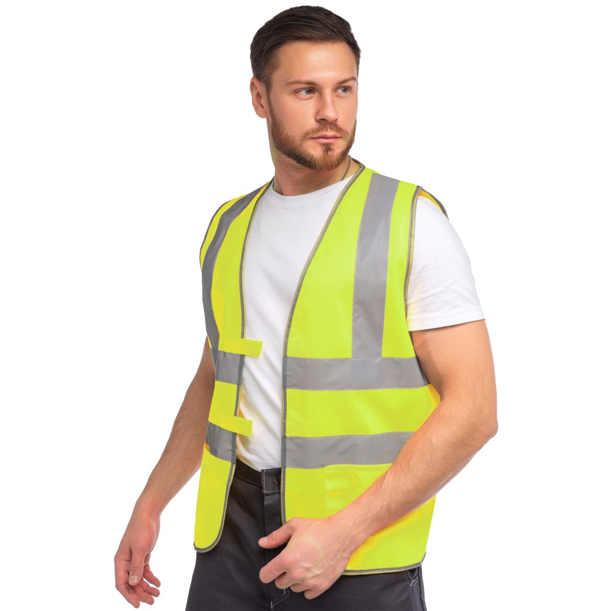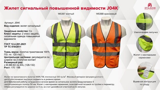 Жилет сигнальный изготовлен в соответствии с ГОСТ. Изделие выполнено из трикотажного полотна (100% ПЭ, плотностью120 гр./м², ВО отделкой). Для безопасной работы сотрудника в местах с плохим освещением на сигнальном жилете предусмотрено 4 светоотражающих полосы 50 мм. Жилет с накладными карманами, окантовочной тесьмой по пройме и периметру. Объем регулируется по ширине на 4 см, за счет удлинённой ответной части липучки.